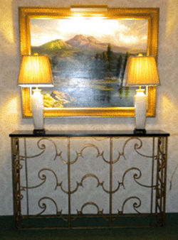 blinds), lighting, wood furniture and upholstery, art work